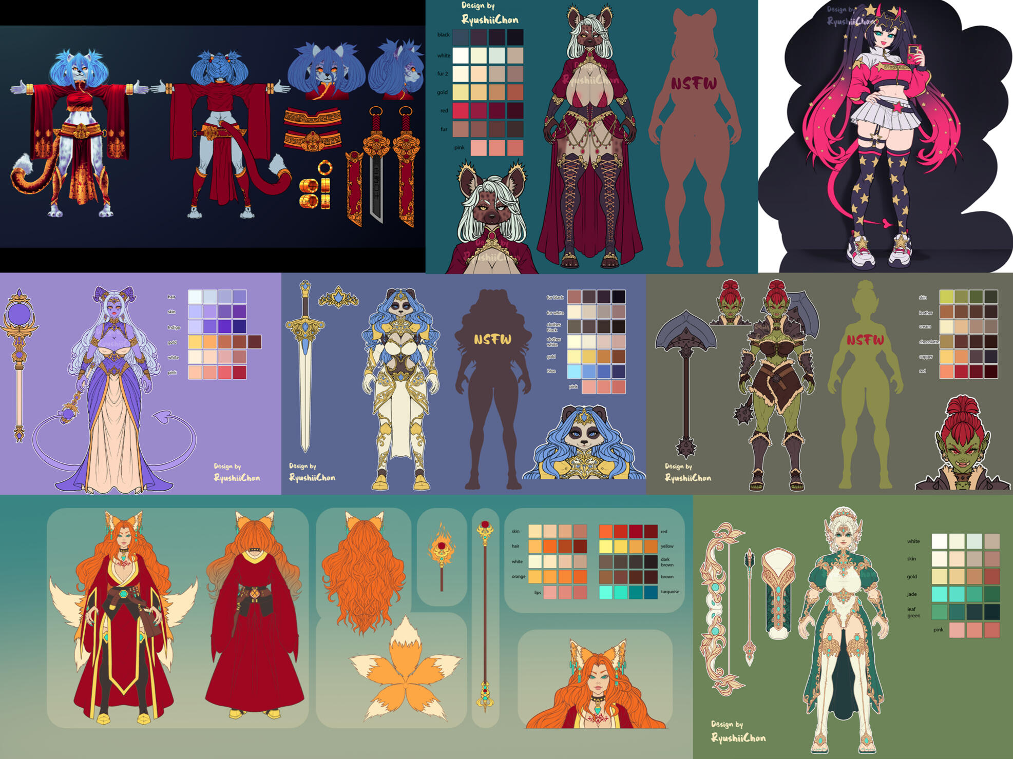 This section will also be updated, but for now the samples are of adoptables I have designed and sold. A character design reference sheet will be more complex and include different portrait poses with different expressions, other callouts such as closeups of certain parts or pulled out items from the design to be viewed fully from various sides (for example a bag the character wears, viewed separately from whatever angle is desired) or tattoos or clothes patterns/designs, chibi versions etc.