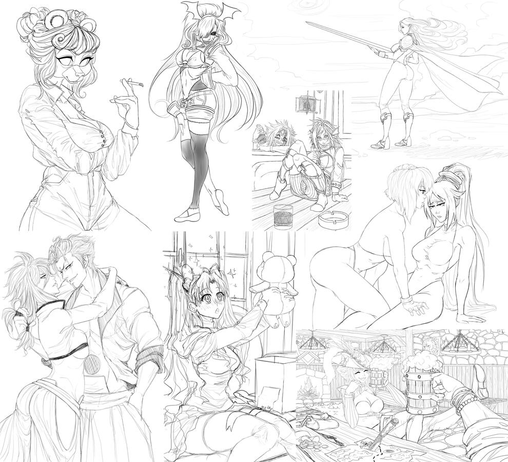 These range up from bust shots to full body. Cleaned sketches, no colors. May include backgrounds and/or multiple characters.