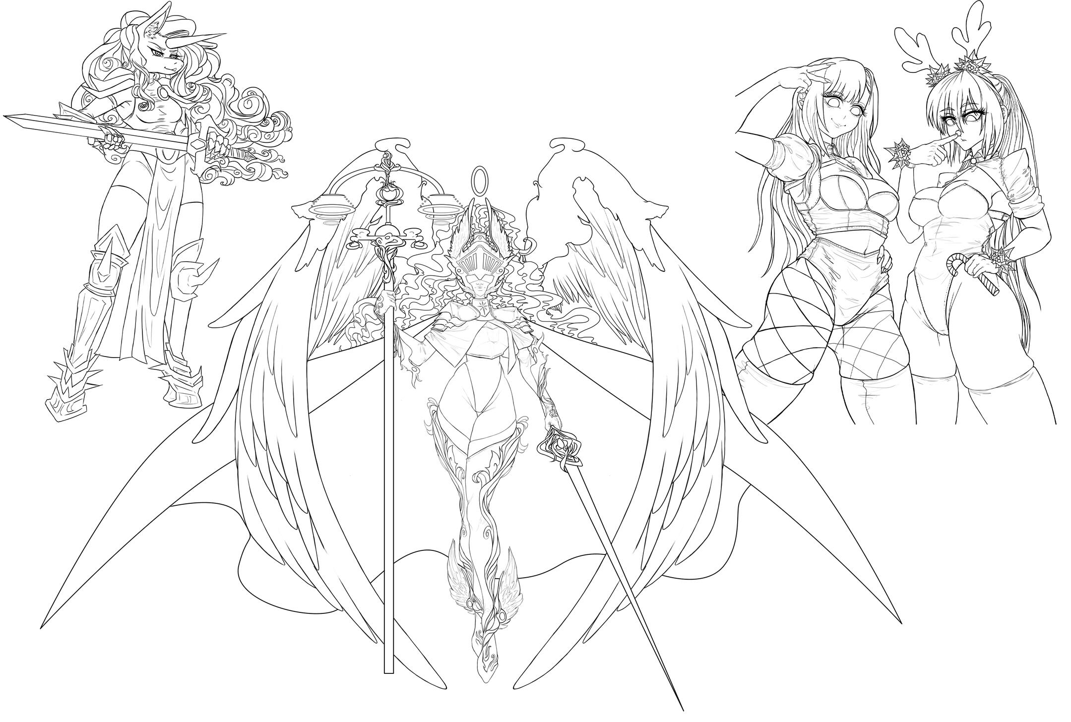 Base colors added, but can also include some shading. Half body or full body of one or more characters.
